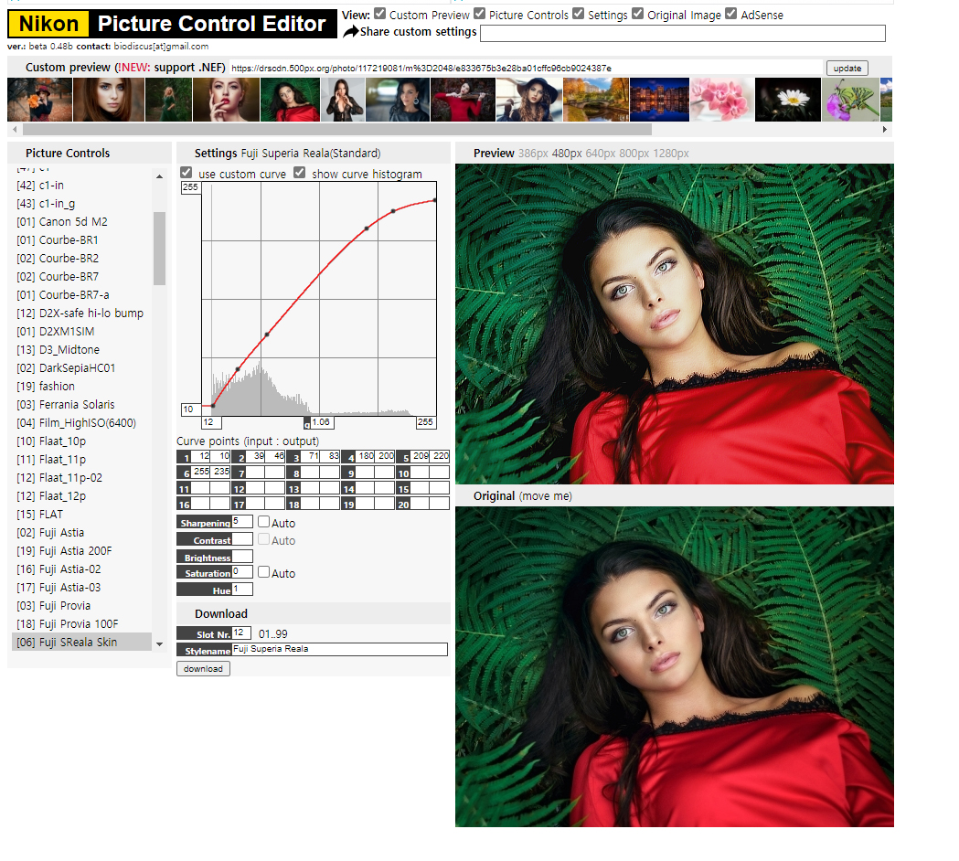 왼쪽 부분에 보시면 Reala, T-max 등등 필름 효과들도 있고 캐논 5D m2효과도 있습니다. 원하시는 스타일을 누르시면 오른쪽에 샘플 화면이 뜹니다. 아래가 오리지널이고 위부분이 변경된 픽쳐 컨트롤입니다. 히스토그램까지 볼 수 있어서 대충 이미지 정보를 파악할 수 있습니다. 그리고 히스토그램 그래프를 조정해서 나만의 픽쳐 컨트롤을 만들 수도 있습니다. 가장 상단에 광고 부분 밑에 그림을 누르시면 샘플 예제를 바꾸실 수 있습니다.