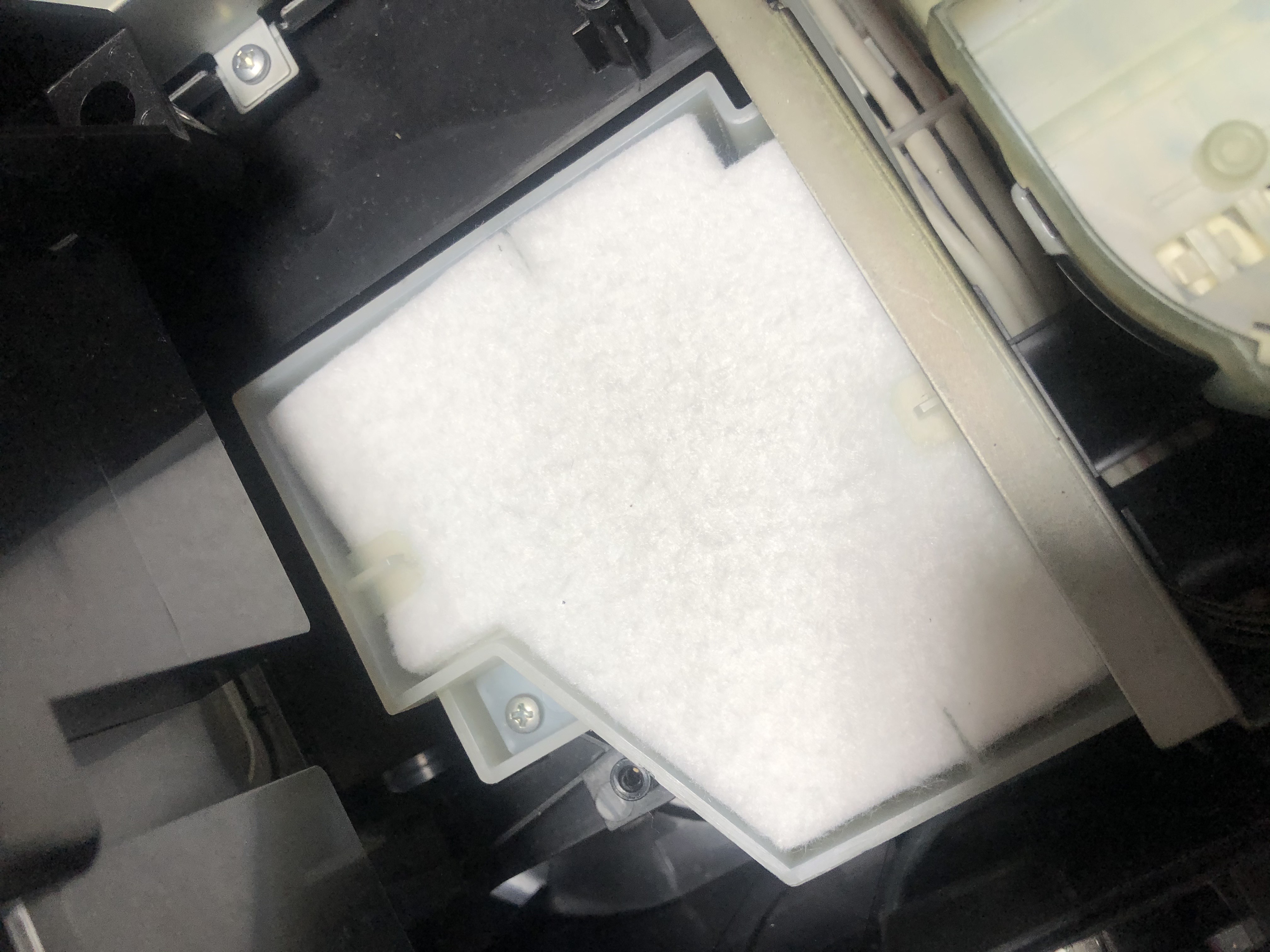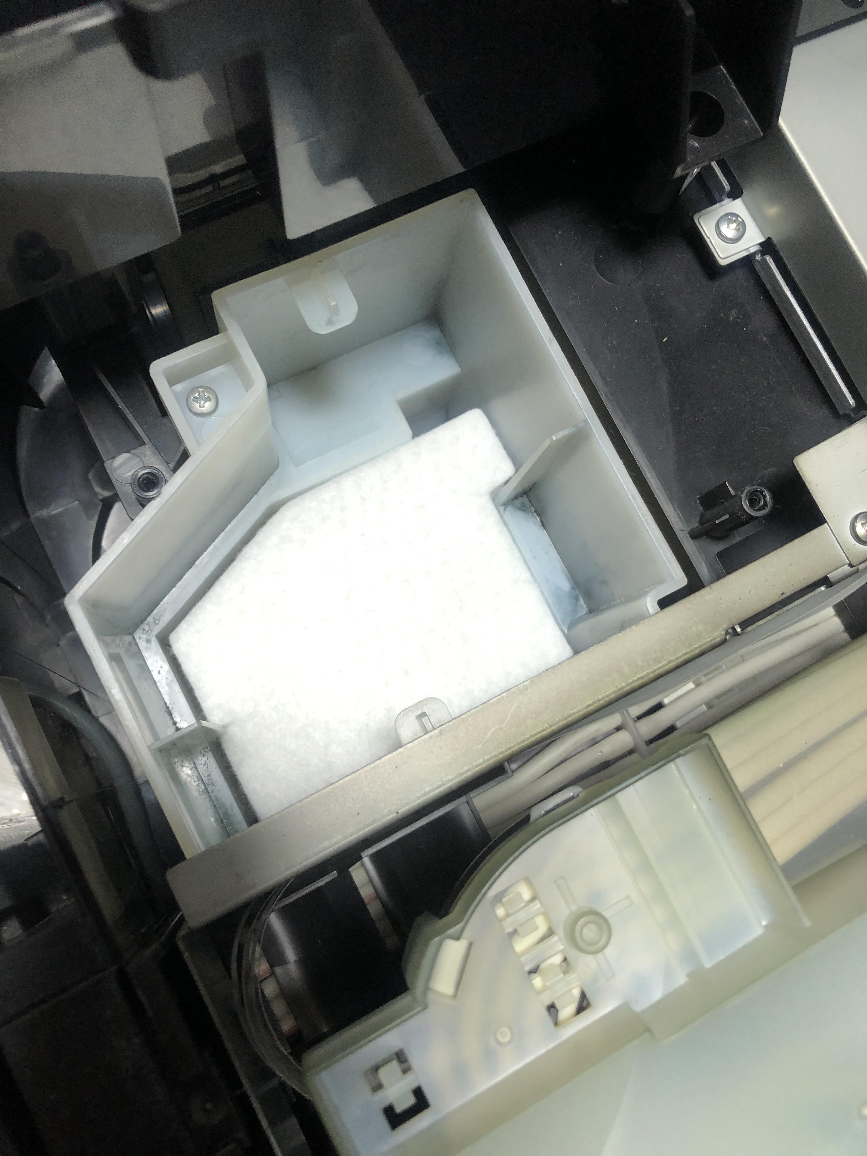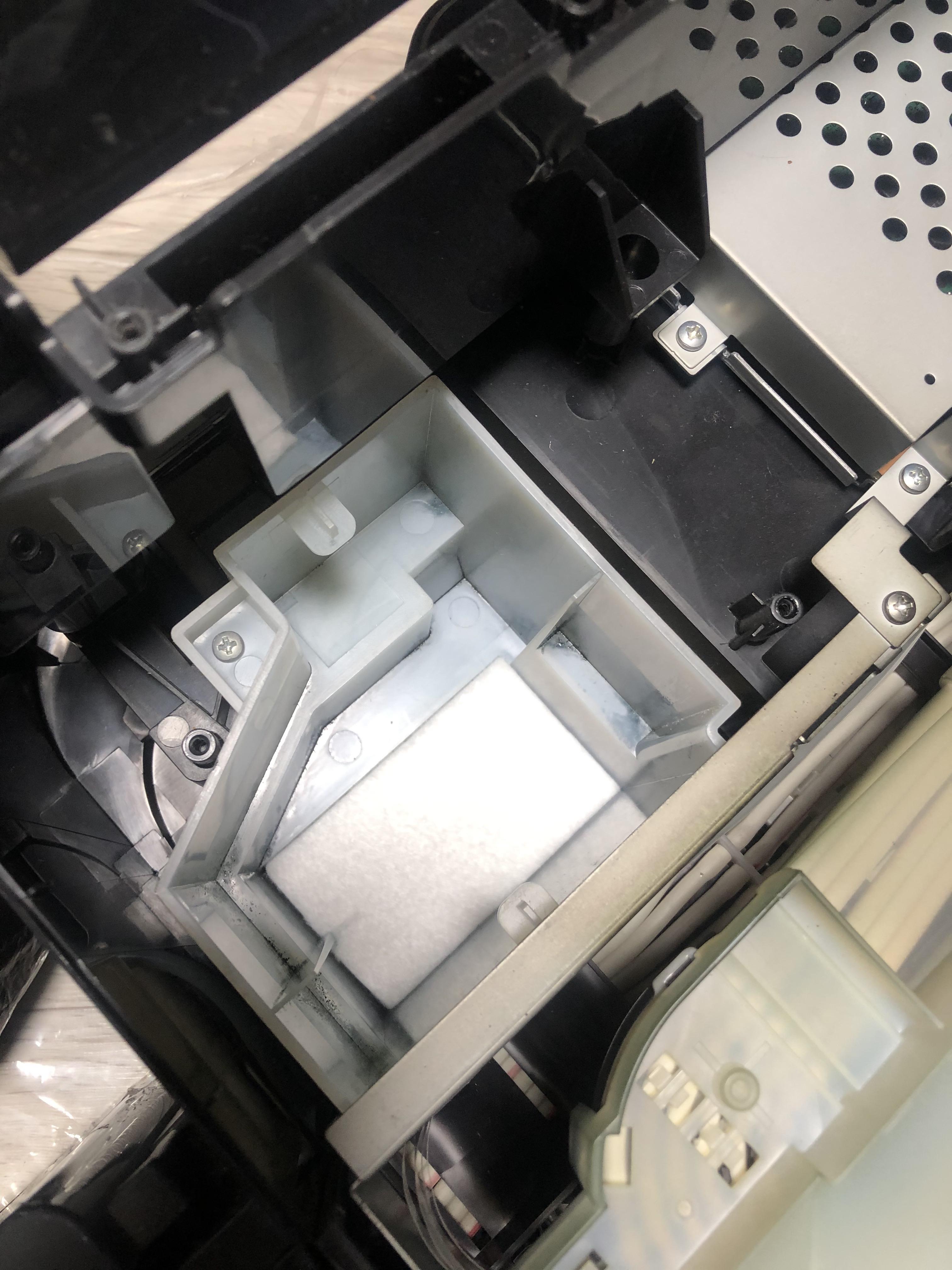 먼저 나사를 몇 군대 풀어서 뚜껑을 제거하면 오른쪽 하단에 스펀지가 보입니다. 저쪽이 잉크패드 쪽입니다.