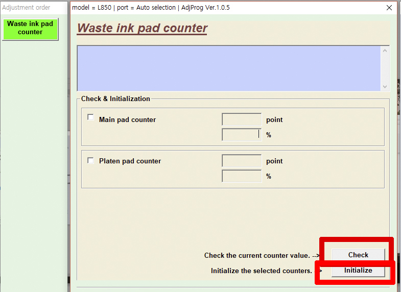 체크 누르셔서 얼마 남았나 확인하시고 밑에 Initialize 누르시면 카운터가 초기화됩니다.