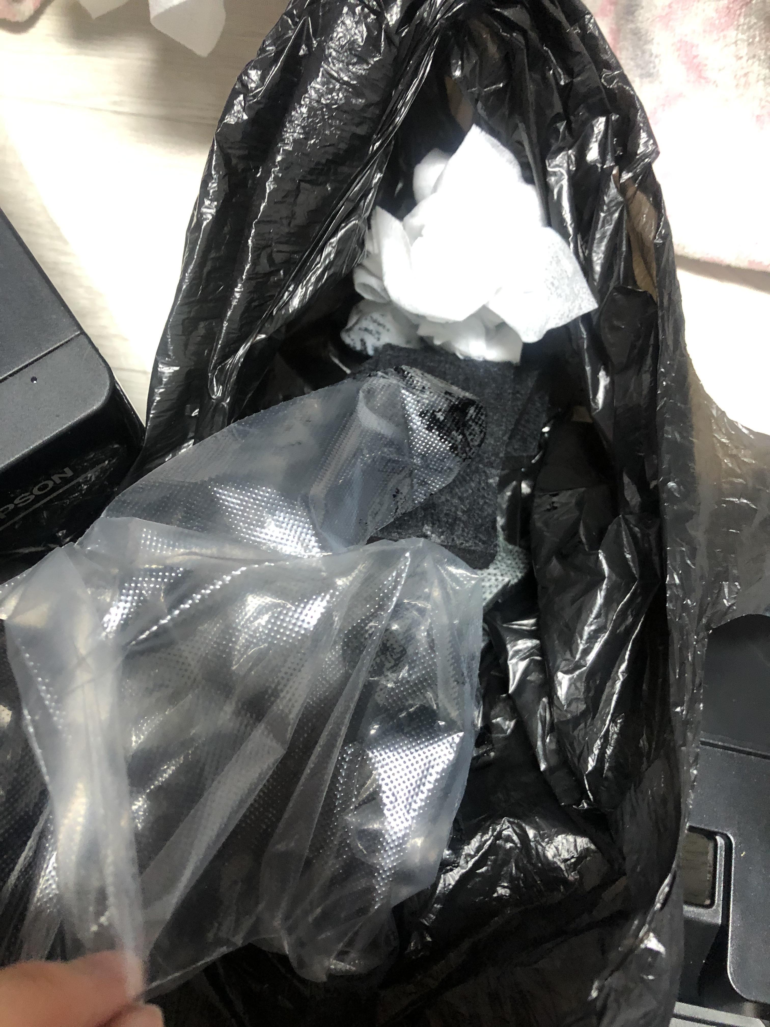 스폰지를 비닐장갑 끼고 조심히 제거하고 나니 폐잉크로 엉망입니다. 갈아 끼우기 전에 물티슈로 싹 닦아주었습니다.