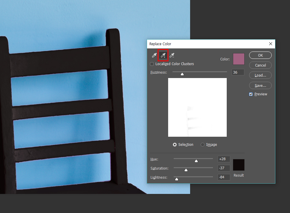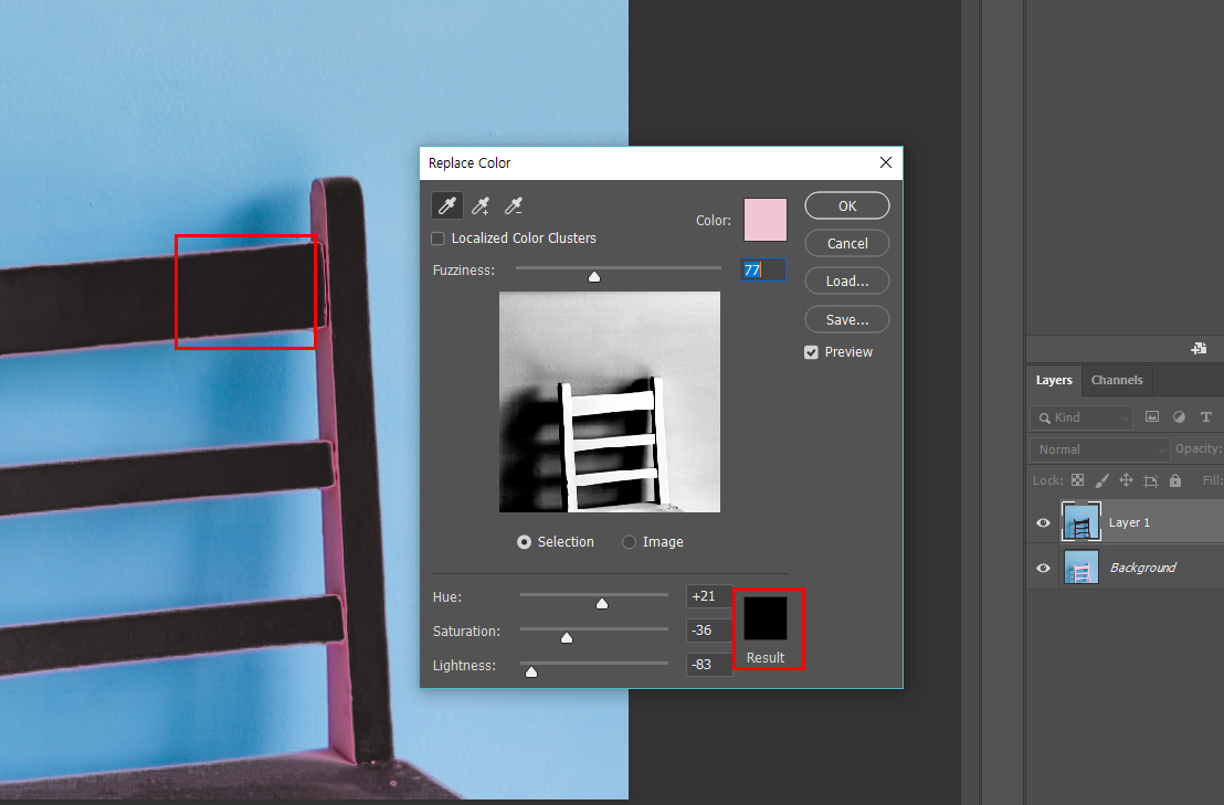 리플레이스 컬러를 사용할 때는 색상이 단순한 이미지로 할 때 좋습니다. 빠르고 쉽지만 색상 폭이 넓은 이미지를 작업할 때는 다른 방식을 사용하는 게 좋습니다.