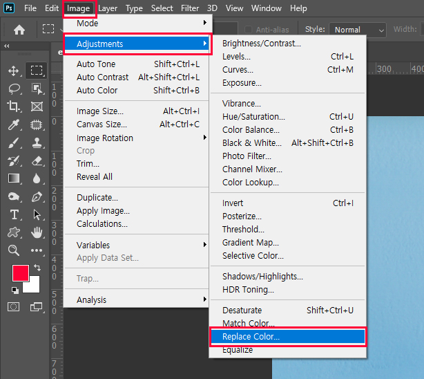 ▣ 상단 Image(이미지) -> Adjustments(조정) -> Replace Color(색상 대체) 클릭합니다.